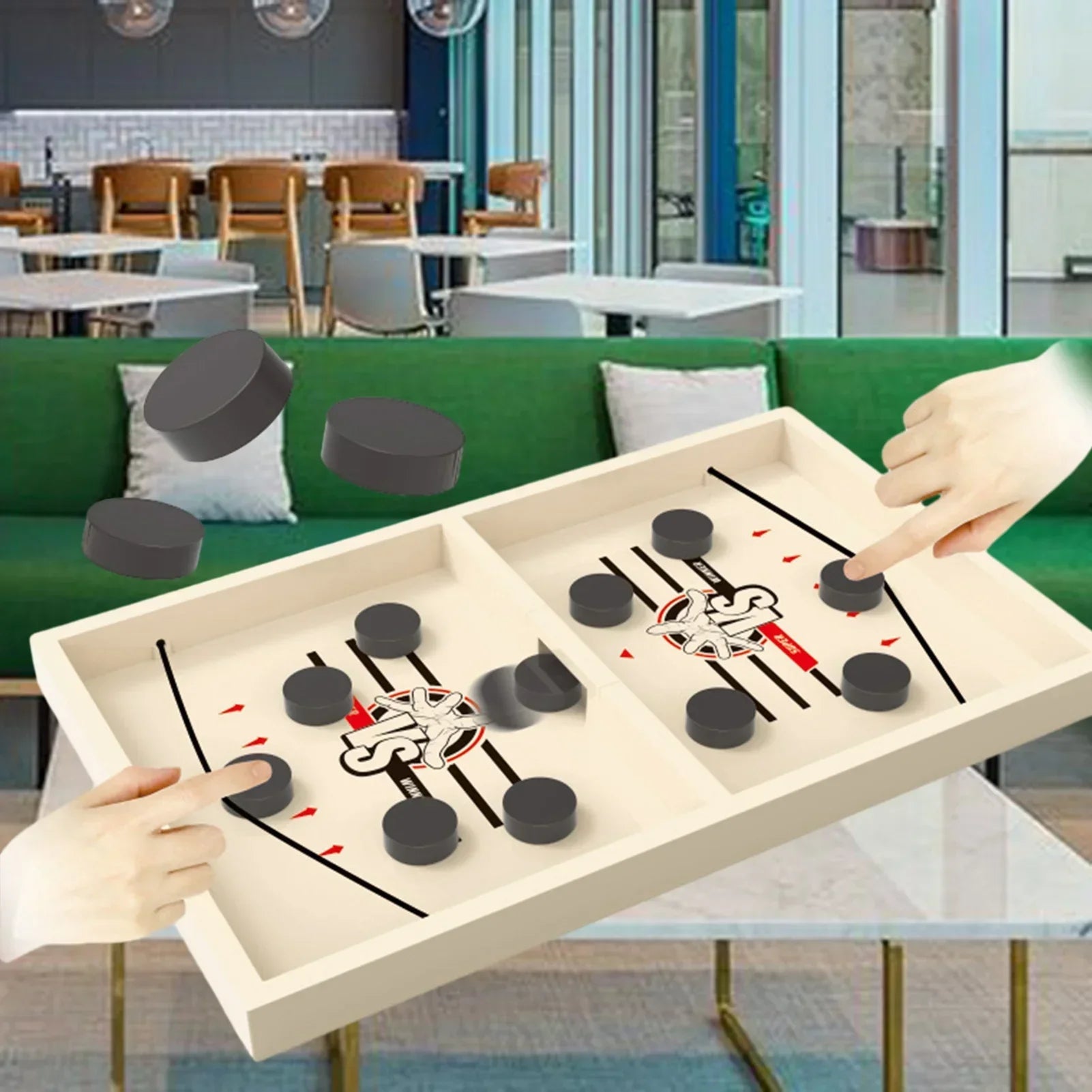 • Features two players and five pucks each, creating an engaging challenge to score while defending.